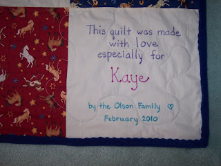 Each member of my family made a block that said something special about Aunt Kaye. I added a few blocks that highlighted some special events from her life. The red and blue blocks are horse print fabrics because she always enjoyed horses.